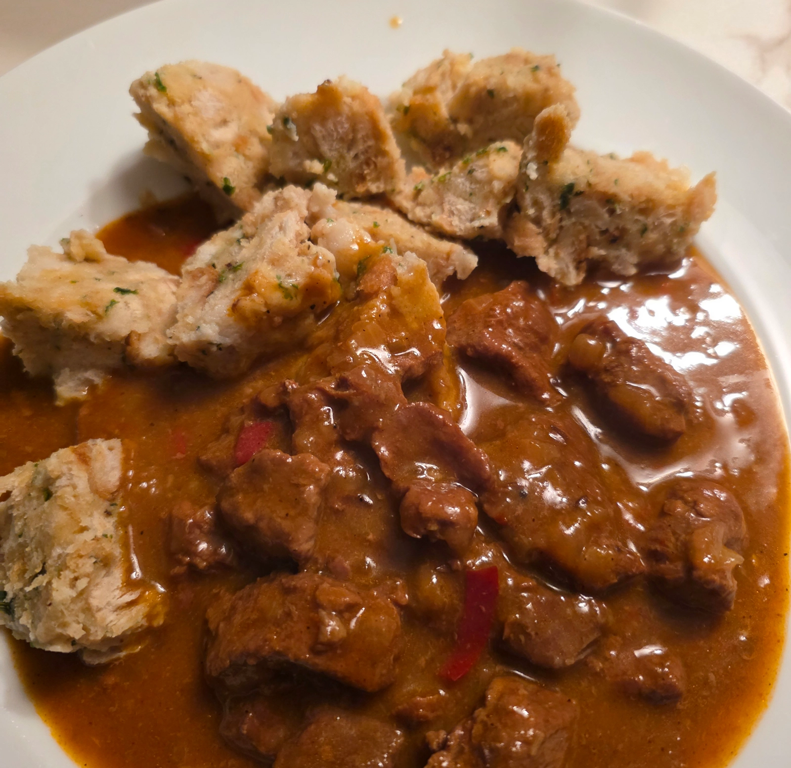 Der Gulasch wird mit vielen Zwiebeln und einer Peperonischote geschmort und mit Paprika pikant abgeschmeckt. Statt Kartoffelklößen gibt es bei uns oft auch Ebly oder Semmelknödel dazu.